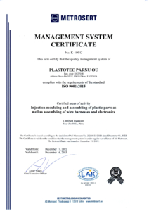 Plastotec Pärnu OÜ is implementing a qualityassurance system complying with EN ISO  standard 9001: 2015 .